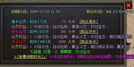 \<会员权益:/FCOLOR=243><1.12倍攻击、自动捡取、黄金斗笠、怀旧宝石、每日抽奖系统/FCOLOR=242>\